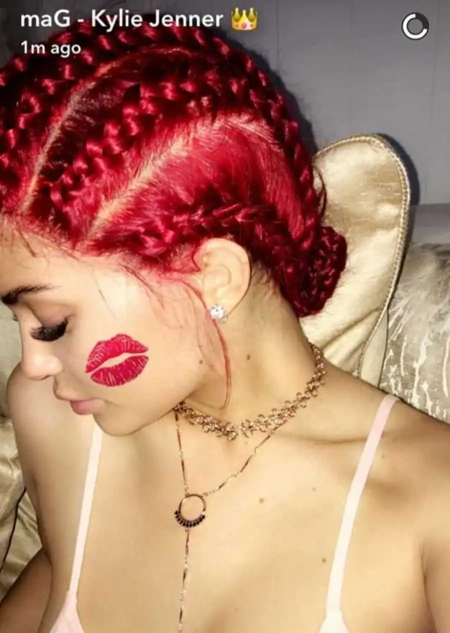 The KUWTK star unveiled bright red cornrows on her Snapchat account last night, which was in stark contrast to her usual long dark locks.