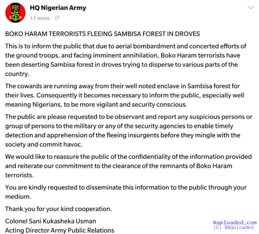 Nigerian Army raises alarm as Boko Haram membersflee Sambisa forest