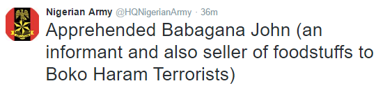 informant and also seller of foodstuffs), Isah Abakar (an Ameer) and Usman Abasa, (who specializes on cattle rustling and selling of food stuffs), as well Bukar Gujja (a tailor who prepare clothes for the terrorists) and Bukar Kahalifa (also a tailor who prepares the dress for the Boko Haram terrorists), are presently undergoing interrogation.
