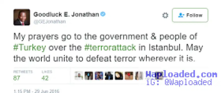 Former Pres. GEJ commiserates with the Turkey govt over the terror attack in Istanbul
