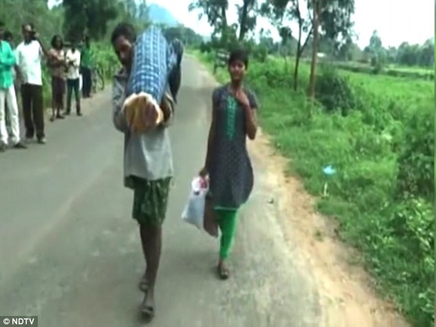 Dana Majhi was filmed with his wife over his shoulders wrapped in sheets and his heartbroken teenage daughter by his side as he headed towards his home nearly 50 miles from the hospital in Bhawanipatna town, India.