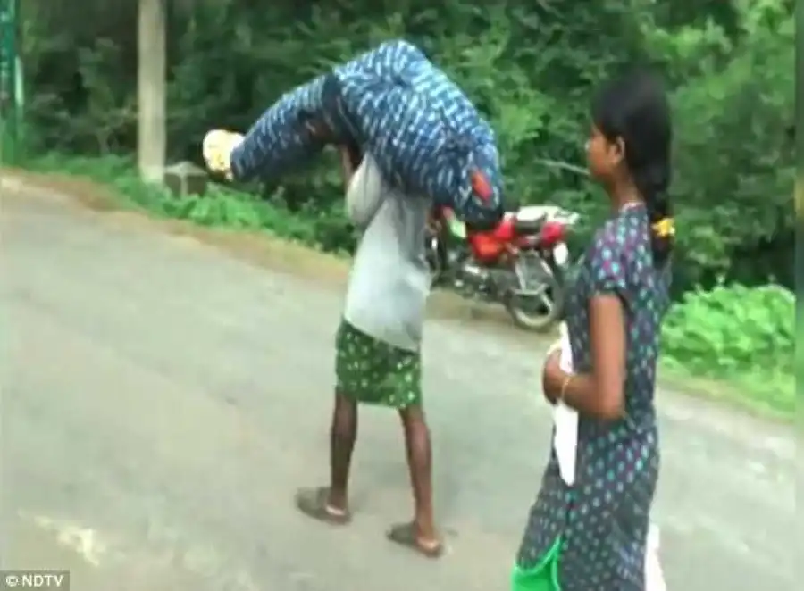 A Poor Indian man had no choice but to carry his dead wife on his shoulder for seven miles when a hospital would not pay for her to be taken home.