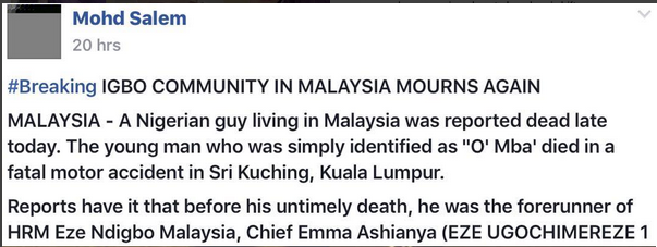 According to reports, an active member and the forerunner of the Eze Ndigbo community in Malaysia died in a fatal car accident in Kri Kuching, Kuala Lumpur.