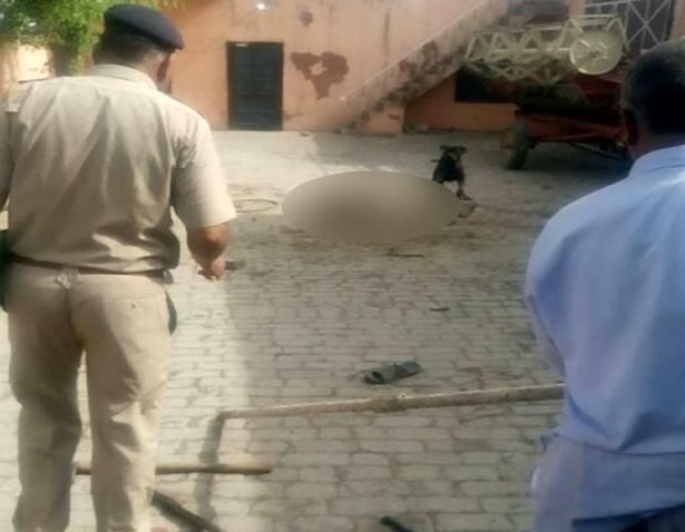 Footage of the aftermath shows the officers were unable to get near Tiger as Mr Ram's bloodied body lie in the courtyard of the farm in Panipat, Haryana, India.
