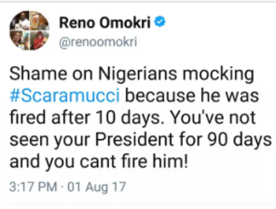 So, Reno Omokri chastised Nigerians for mocking Donald Trump's former White House Communications Director, Anthony Scaramucci, because he was fired after only 10days of being hired, while we haven't seen the Nigerian President for 90 days but can't fire him. Well a Twitter user gave him an advice on what to do about the President. He wrote: