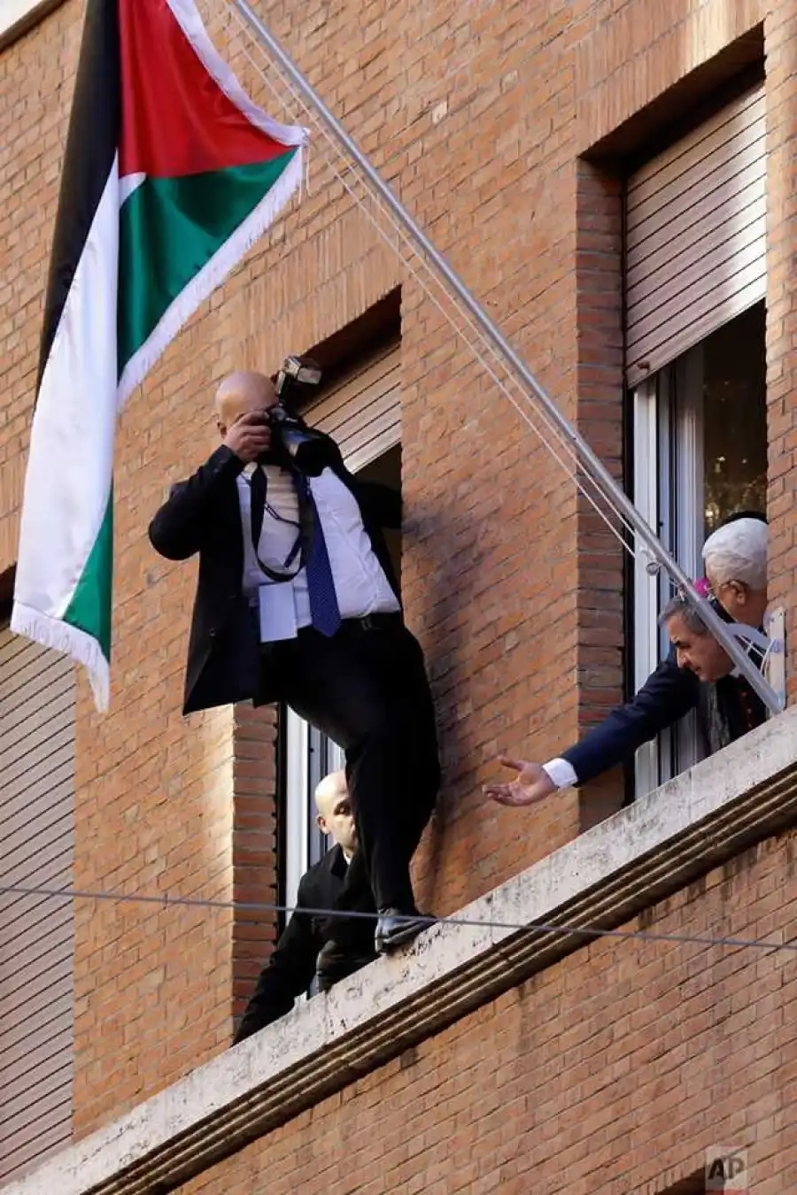 A photographer steps out of a window to take pictures of Palestinian President Mahmoud Abbas.