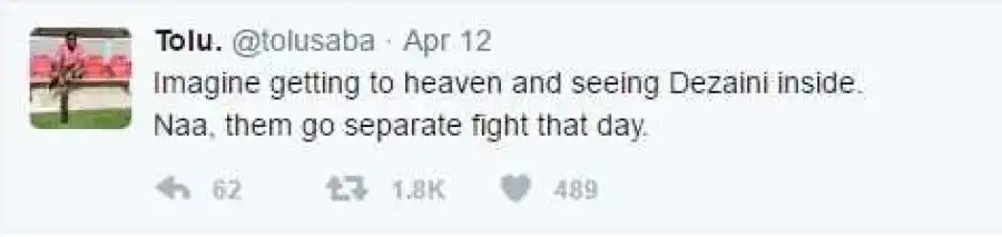 Twitter user, Tolu with handle (@Tolusbaba) has revealed what he will do if he gets to heaven and sees former minister of petroleum, Diezani Alison- Madueke.