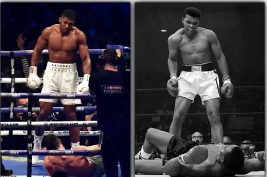 World's Heavyweight Winner, Anthony Joshua Copies Late Mohammed Ali's Stance After Knocking Down Opponent (Photos)