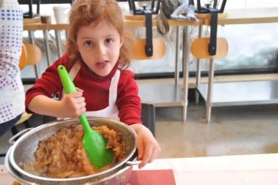 frying pan she used and start to pick the crumbs