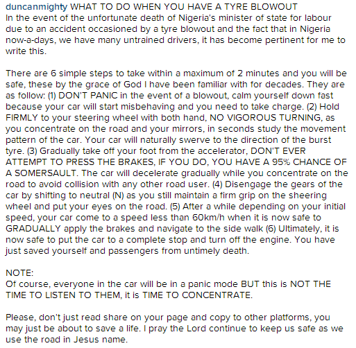 The singer who is popularly referred to as Port Harcourt's first son, shared this photo of one of his cars on Instagram as he gave tips on what to do when your tyre bursts while on top speed.