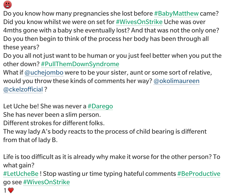 In a post on her Instagram page, actress Chioma Akpotha slammed Internet trolls who attacked actress Uche Jombo over her new weight since she delivered her son Matthew. Chioma asked Uche's attackers to let her be. Read what Chioma wrote beneath;