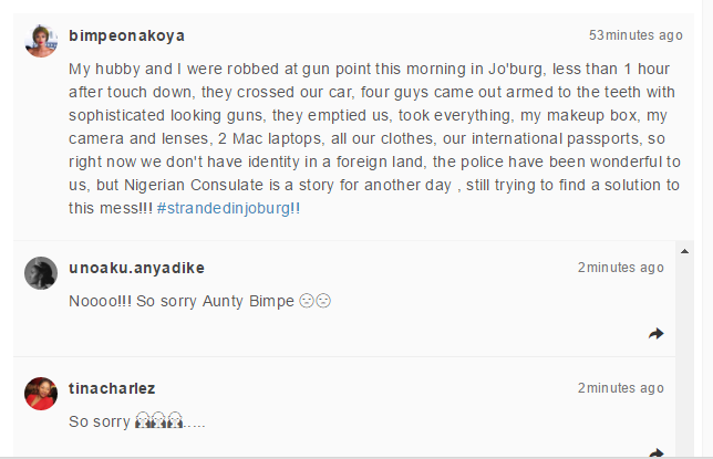 Nigerian award winning makeup artiste Bimpe Onakoya is currently stranded in Johannesburg South Africa after she and her husband were robbed at gunpoint less than 1 hour after they touched down in the city.