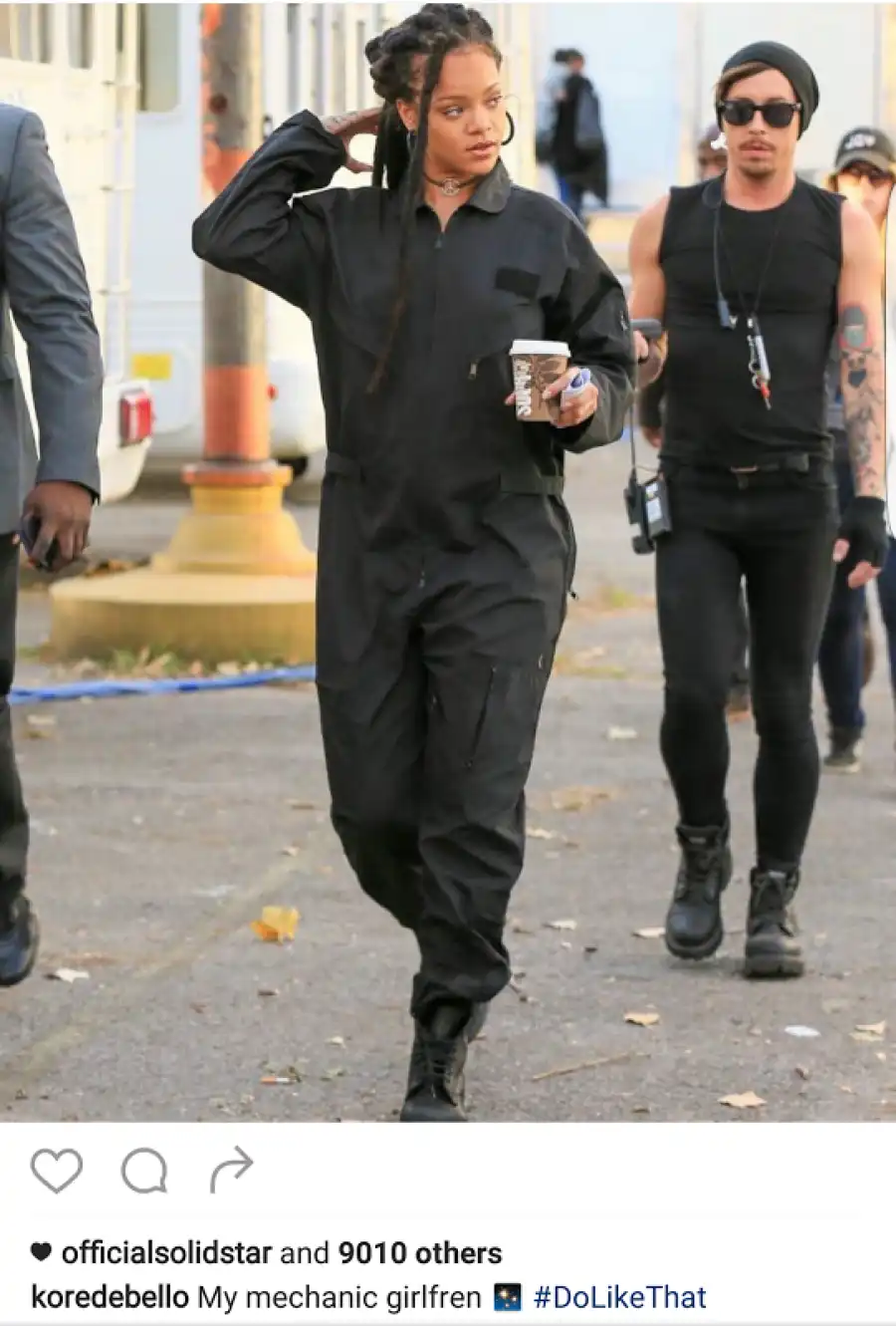 Korede Bello shared this photo of singer, Rihanna, wearing an outfit that was similar to the one he wore to the MAMA Award’s and captioned it: ‘ My mechanic girlfren ? #DoLikeThat ‘. A fan saw the comparison and said: