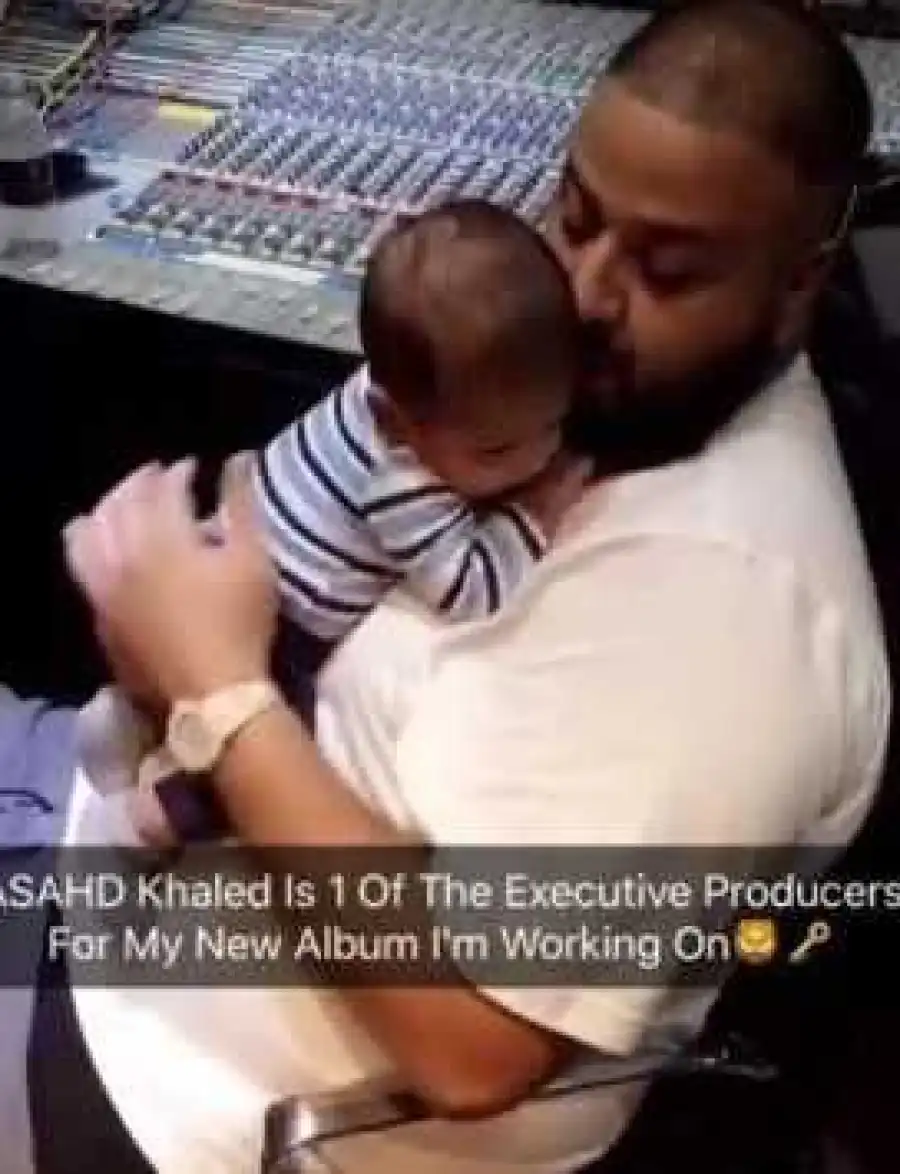 DJ Khaled has revealed his son, Asahd, will be one of the executive producers for his new album. He shared photos of him cuddling his son while in the studio and captioned it "My son is going to executive produce my new album!!! "