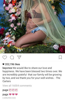 Beyonce wrote, “We would like to share our love and happiness. We have been blessed two times over. We are incredibly grateful that our family will be growing by two, and we thank you for your well wishes. – The Carters”