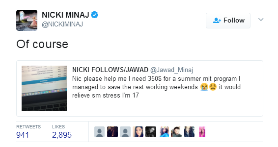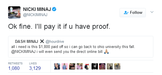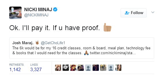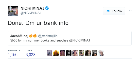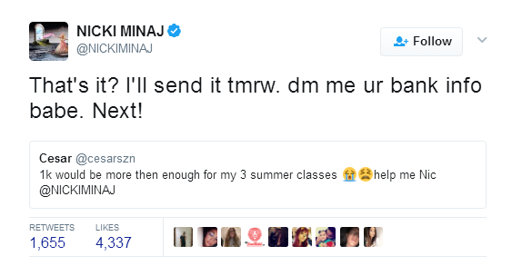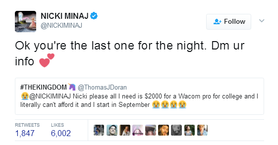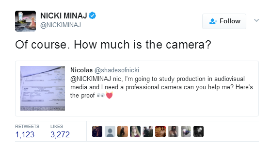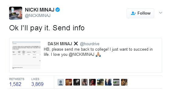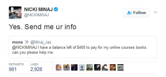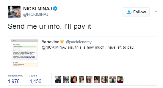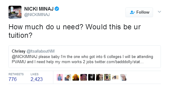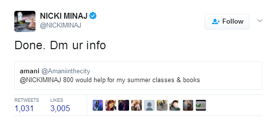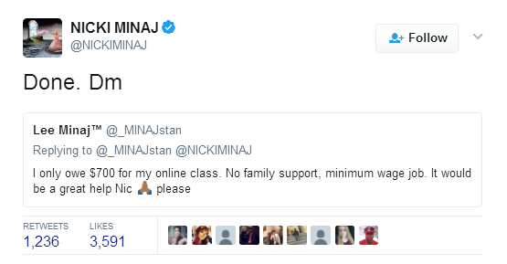 Not only will she be paying off some of their student loans, but also pay for college tuition, summer and online classes, buy professional cameras and books for undergraduates. Although Nicki has now stopped her giveaway, she promised to continue helping out in a month or two.