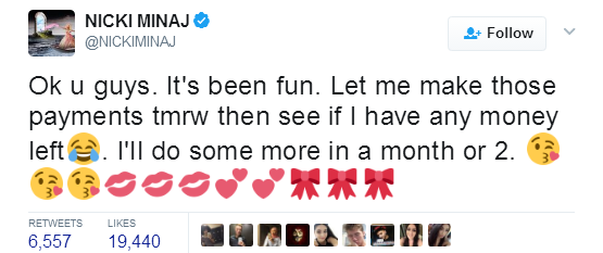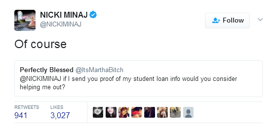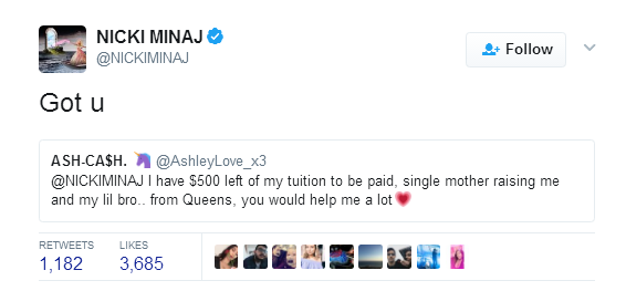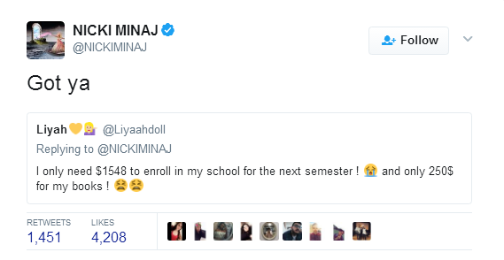 Nicki Minaj Shows Generousity As She Pays Fans' Loans, School Fees & Books On Twitter