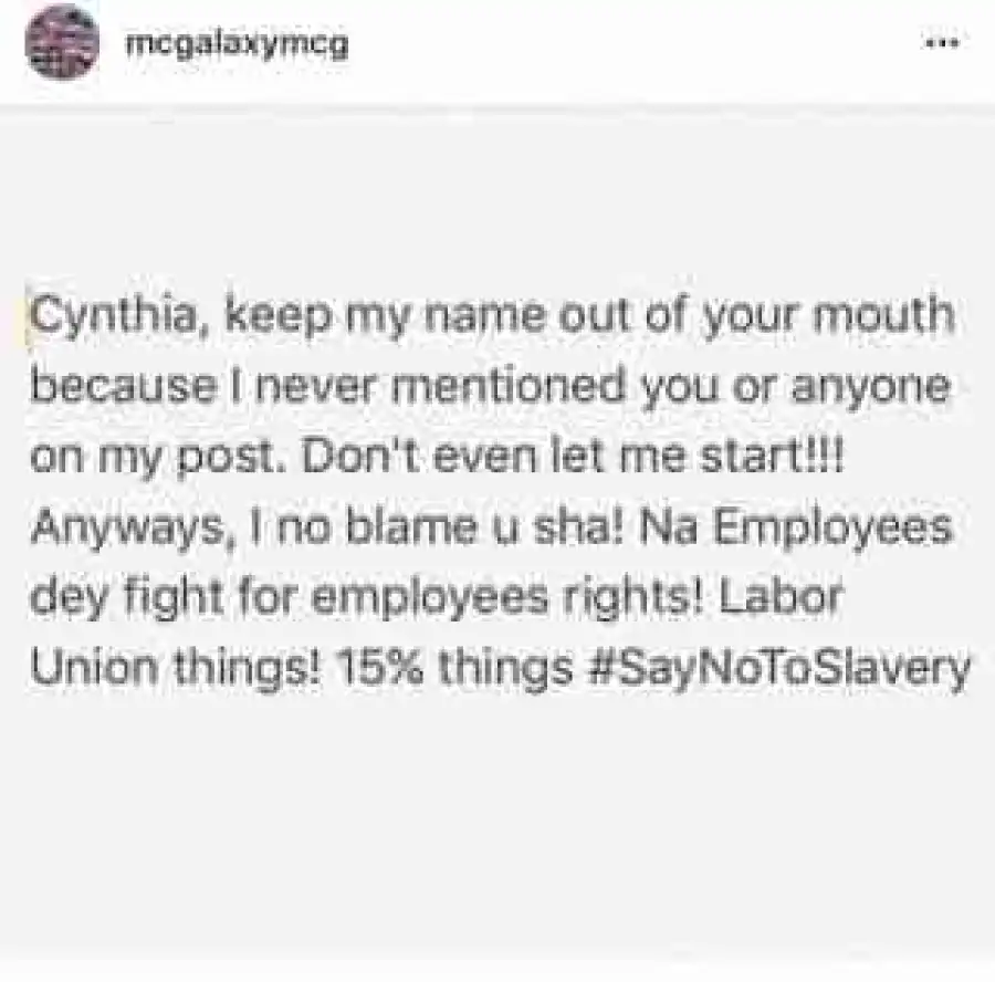 Na Employees De Fight For Employees Right - MC Galaxy Fires Back At Cynthia Morgan