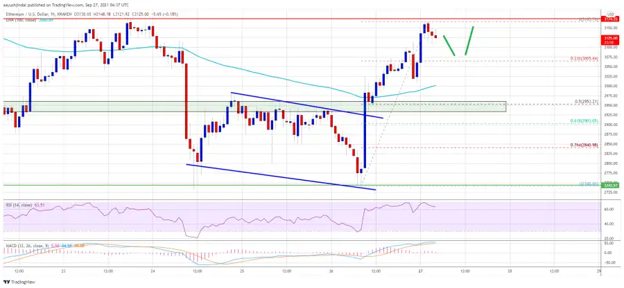 There used to be additionally a destroy a big declining channel with resistance close to $2,925 at the hourly chart of ETH/USD. The pair settled above the $3,000 zone and close to the 100 hourly easy shifting reasonable. It won traction and climbed above the $3,100 stage.