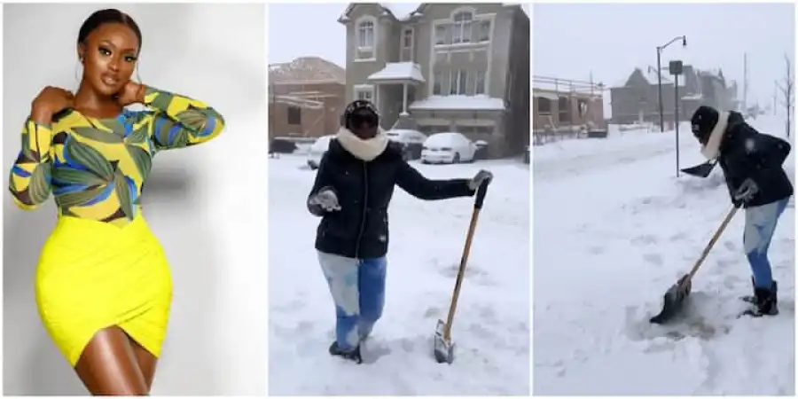 Actress Linda Osifo Cries Out From Canada As She's Forced To Shovel Massive Heap Of Snow (Video)