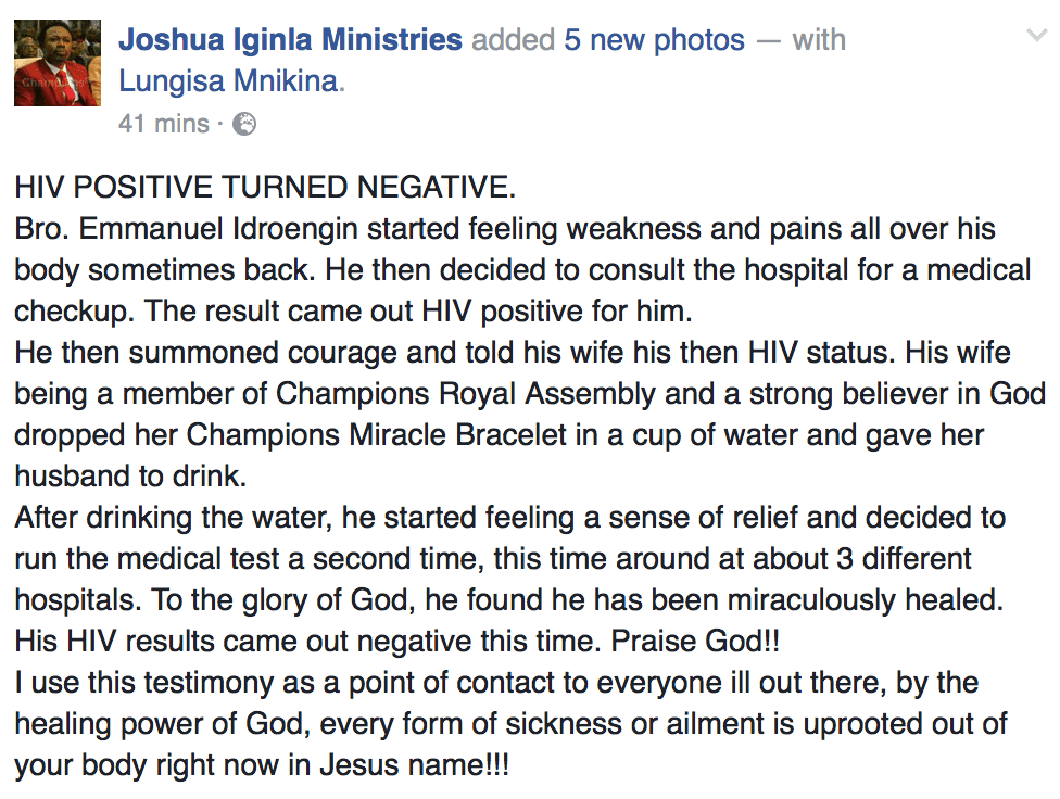 Popular Abuja pastor Joshua Iginla's church has claimed a Nigerian soldier by the name Emmanuel Idroengin was healed of HIV after he drank water their Champions Miracle Braceletwas dropped into.