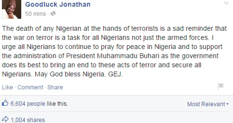 “The death of any Nigerian at the hands of terrorists is a sad reminder that the war on terror is a task for all Nigerians not just the armed forces,” he posted on his Facebook account to his almost two million followers.