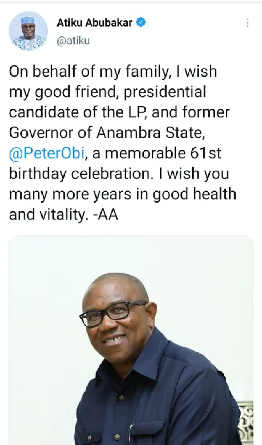 “...On behalf of my family, I wish my good friend, presidential candidate of the LP, and former Governor of Anambra State, H.E Peter Obi, a memorable 61st birthday celebration. I wish you many more years in good health and vitality. -AA...”