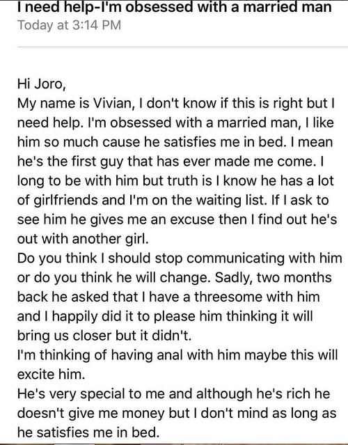 A lady has written to Joro Olumofin to seek advice about her obsession with a married man who was the first to take her to cloud nine in bed.