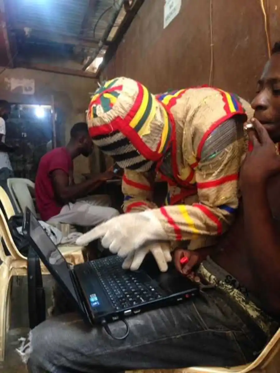 Photos: Nigerian Masquerade Spotted Seriously Chatting Online With A Computer