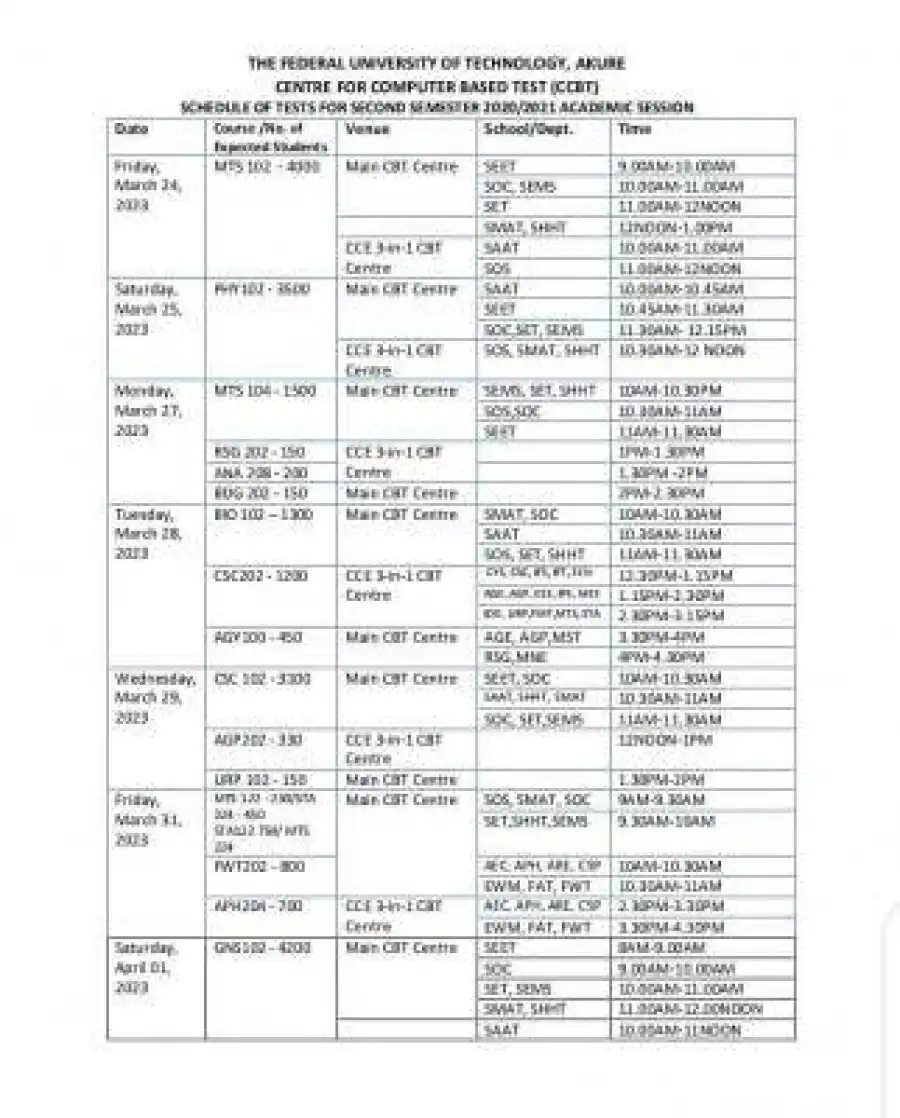 The management of Federal University of Technology Akure (FUTA) has released the second semester Computer Based Test Timetable.