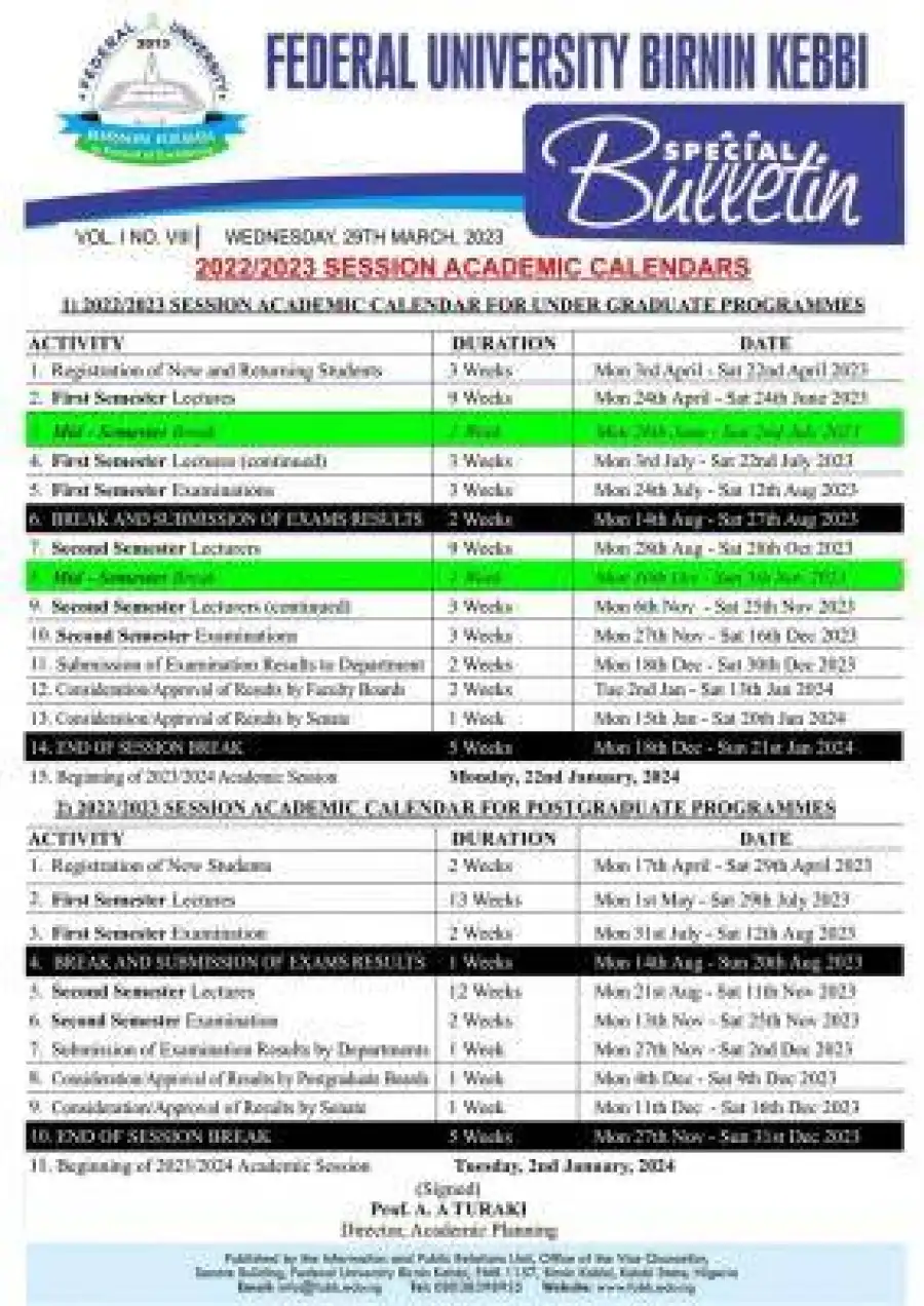 The management of the Federal University Birnin Kebbi (FUBK) has published the Academic Calendar for 2022/2023 academic session. The break down of academic activities, as well as duration are stated below;