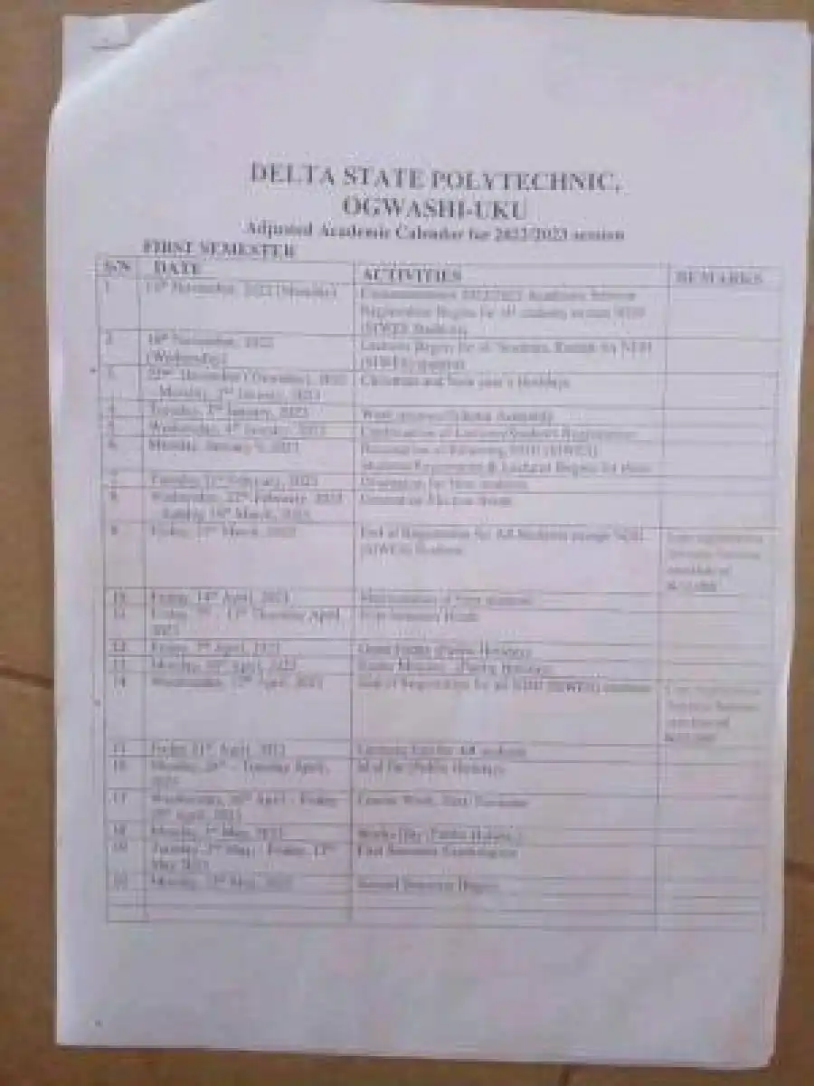 This is to inform the students of Delta State Polytechnic Ogwashi-Uku that the management has released the adjusted cademic calendar for the 2022/2023 academic session.