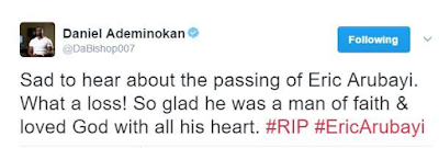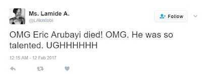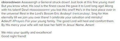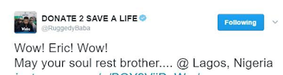 More tributes continue to pour in as the news of Eric Arubayi begins to sink in. Eric died in the evening of February 11, 2017 at Delta State University Teaching Hospital after battling an illness. Some if his celebrity friends who have taken to social media to mourn his demise include Daniel Ademinokan, MI Abaga, Ruggedman, Obiwon and others.
