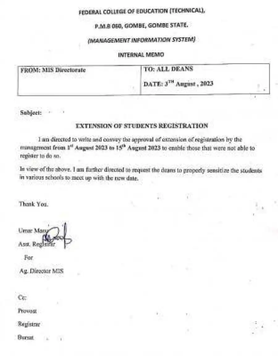 This is to write and convey the approval of extension of registration by the management from 1st August 2023 to 15th August 2023 to enable those that were not able to register to do so.