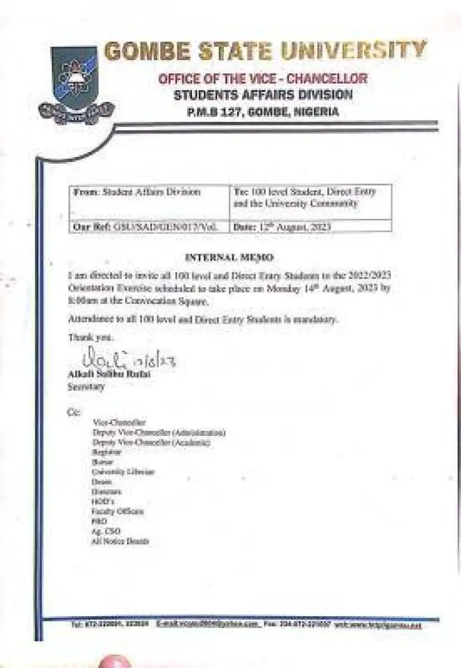 I am directed to invite all 100 level and Direct Entry Students to the 2022/2023 Orientation Exercise scheduled to take place on Monday 14th August, 2023 by 8:00am at the Convocation Square.
