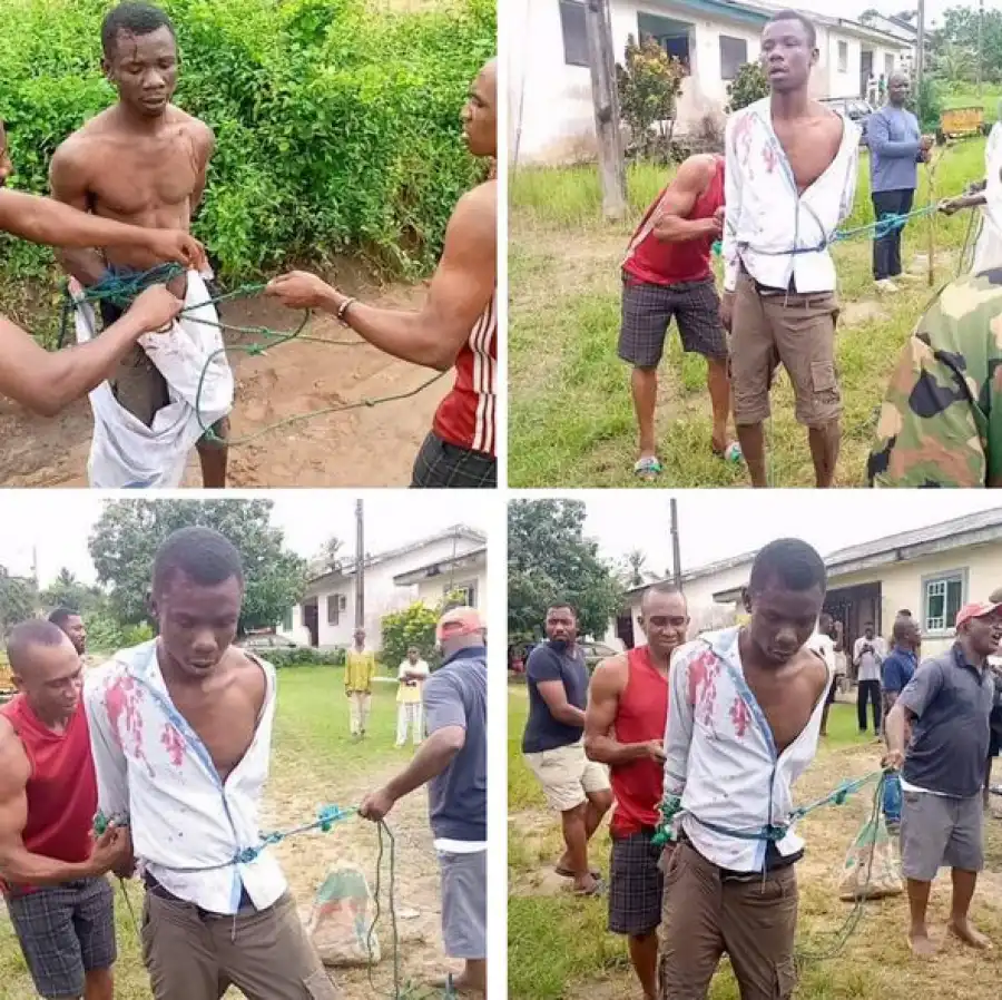 A suspected thief, Thankgod, has been apprehended, brutalized and tied up with a rope in Calabar, Cross River.
