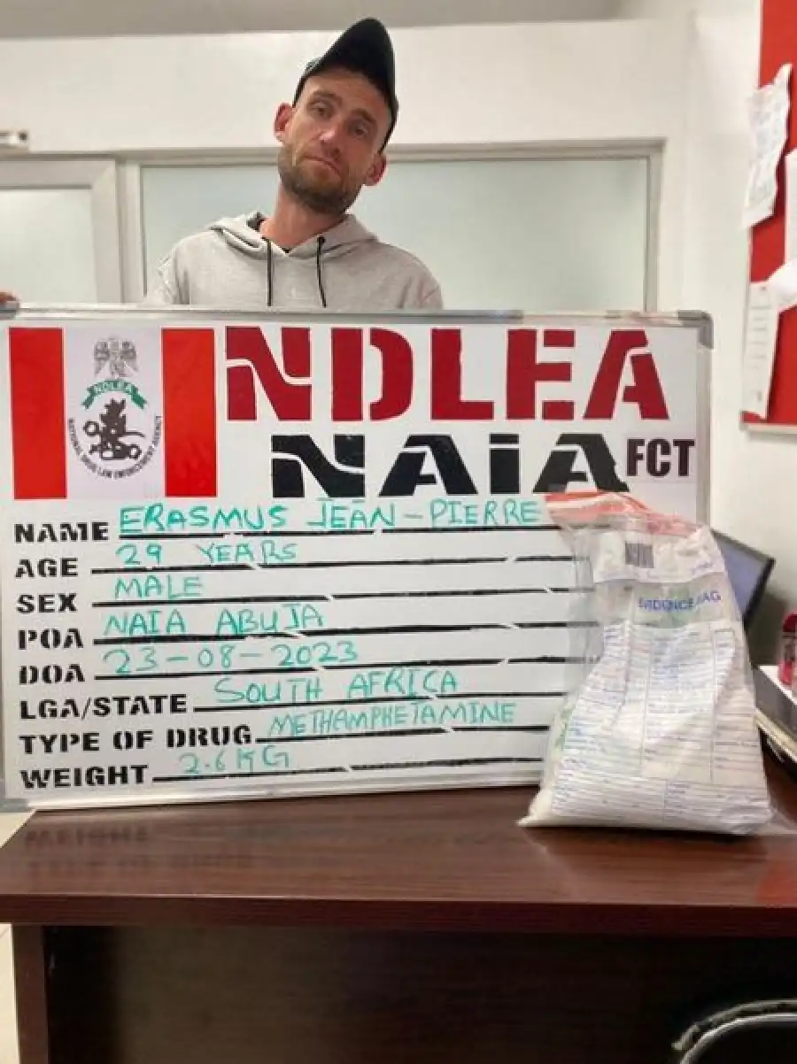 A 29-year-old South African national, Erasmus Jean-Pierre, has been arrested by the National Drug Law Enforcement Agency, NDLEA, while attempting to export 2.6 kilograms of methamphetamine concealed in his luggage to the Middle East through the Nnamdi Azikiwe International Airport, NAIA Abuja on Wednesday 23rd August, 2023.