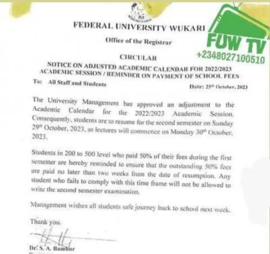 FUWUKARI notice on adjusted academic calendar & reminder on payment of school fees, 2022/2023