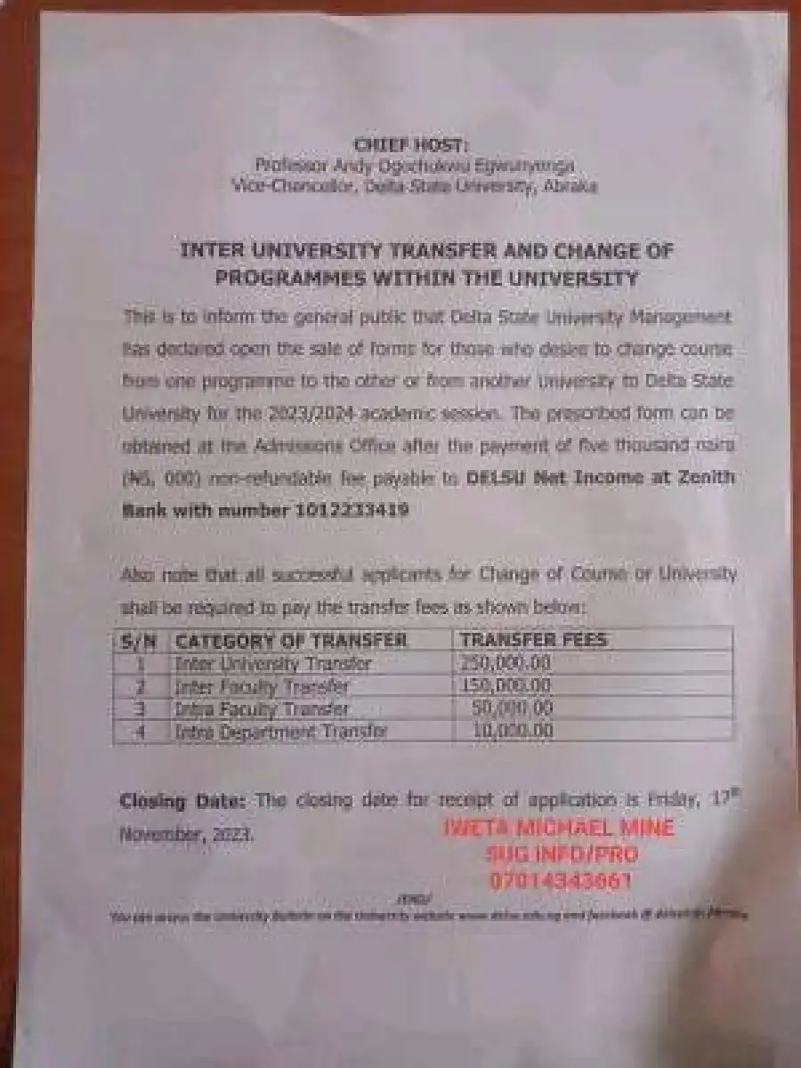 This is to inform the general public that the Delta State University has declared open the sales of forms for those who desire to change course from another programme to the other or from one university to Delta State University for the 2023/2024 academic session. The prescribed form can be obtained at the Admission Office after the payment of Five Thousand Naira (N5,000.00) non-refundable fee payable to DELSU Net Income at Zenith Bank with number 1012233419.