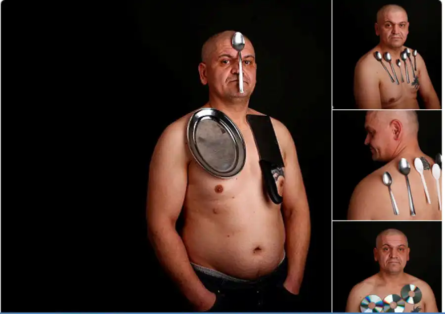 And pictures have emerged appearing to show everyday items such as spoons, forks and knives being attached to his body.