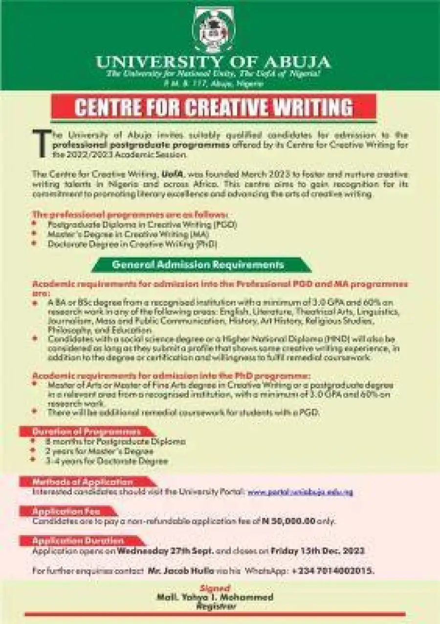 The University of Abuja invites suitably qualified candidates for admission to the professional postgraduate programmes offered by its Centre for Creative Writing for the 2022/2023 Academic Session.