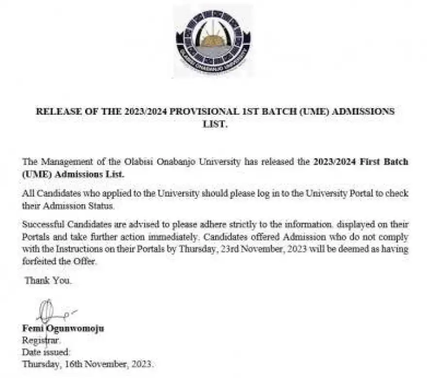 The Management of the Olabisi Onabanjo University has released the 2023/2024 First Batch (UME) Admissions List All Candidates who applied to the University should please log in to the University Portal : https://portal.oouagoiwoye.edu.ng/admission/login.php to check their Admission Status.
