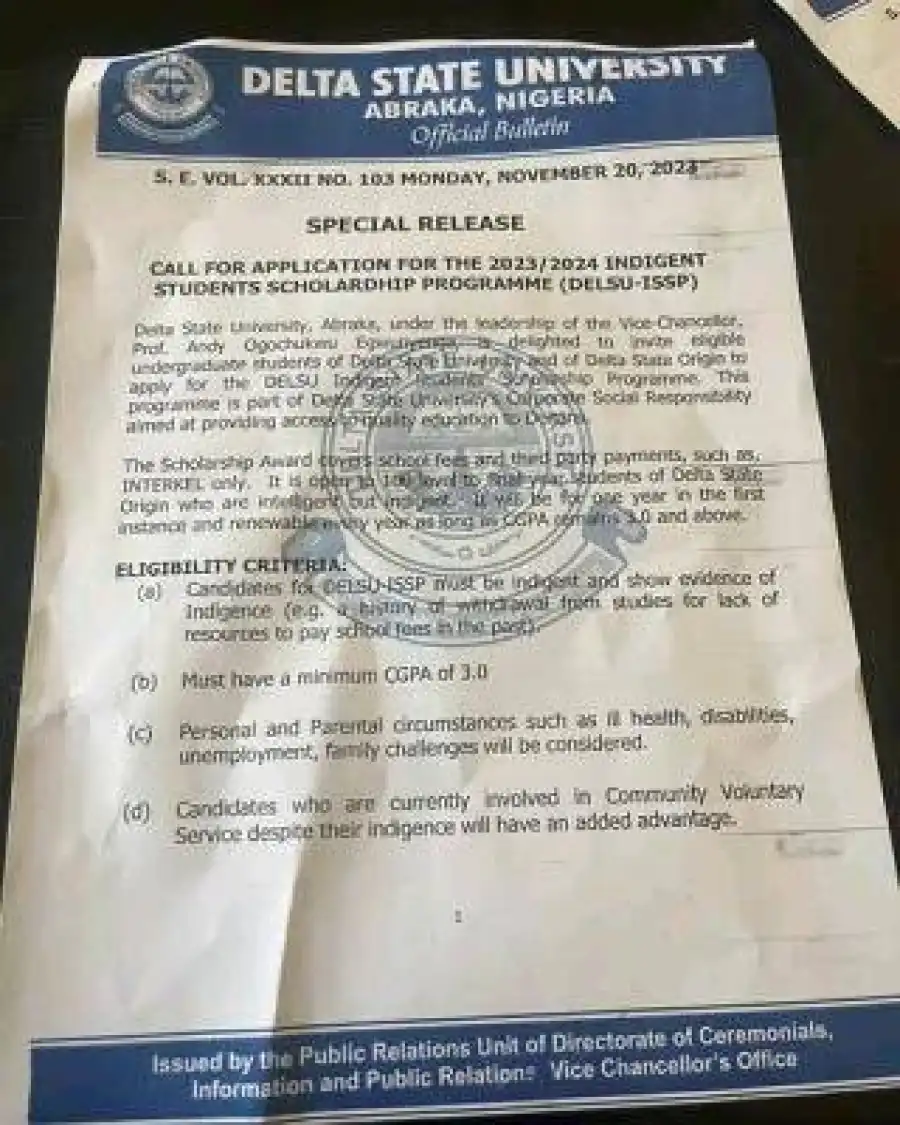Delta State University, Abraka, under the leadership of the Vice-Chancellor, Prof. Andy Ogochukwu Egwunyenga, is delighted to invite eligible undergraduate students of Delta State University and of Delta State Origin to apply for the DELSU Indigent Students Scholarship Programme. This Programme is part of Delta State University's Corporate Social Responsibility aimed at providing access to quality education to Deltans.