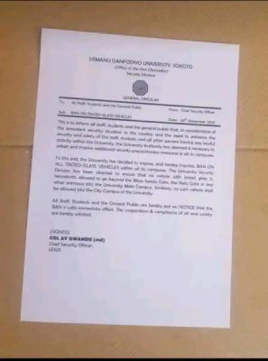 The this end, the University has decided to impose and hereby imposes BANS ON ALL TINTED-GLASS VEHICLES within all its campuses. The University Security Division has been directed to ensure that no vehicle with tinted glass is henceforth, allowed to go beyond the Biya Sanda Gate, the main Gate, or any other entrance into the University Main Campus. Similarly, no such vehicle shall be allowed into the City Campus of the University.