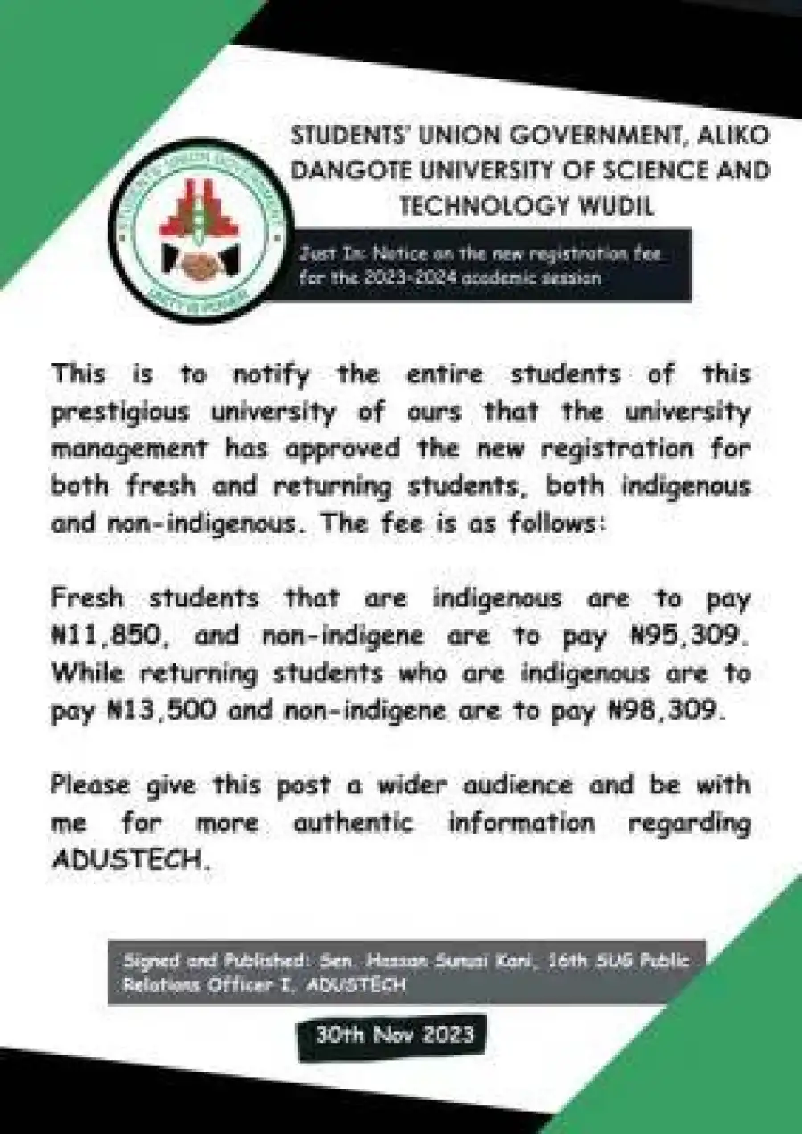 This is notify all students of the Aliko Dangote University of Science and Technology (ADUSTECH) that the university management has approved the new registration fee for both fresh and returning students, both indigenous and non-indegenous. The fee is as follows;