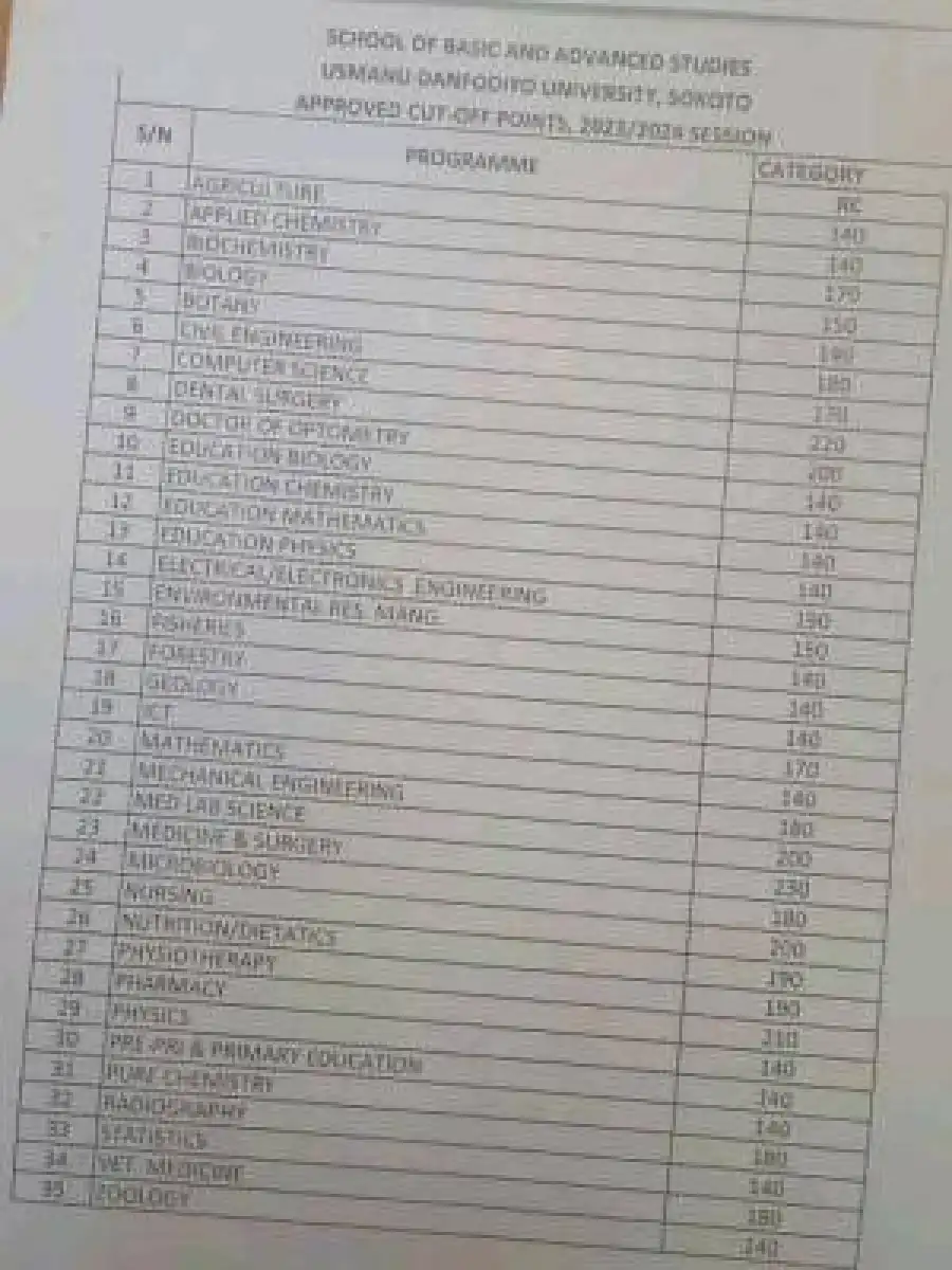 This is to inform the general public especially prospective students of Usman Danfodio University Sokoto School of Basic and Advanced Studies, that the school management has released the 2023/2024 session admission approved Cut-off marks for various departments.