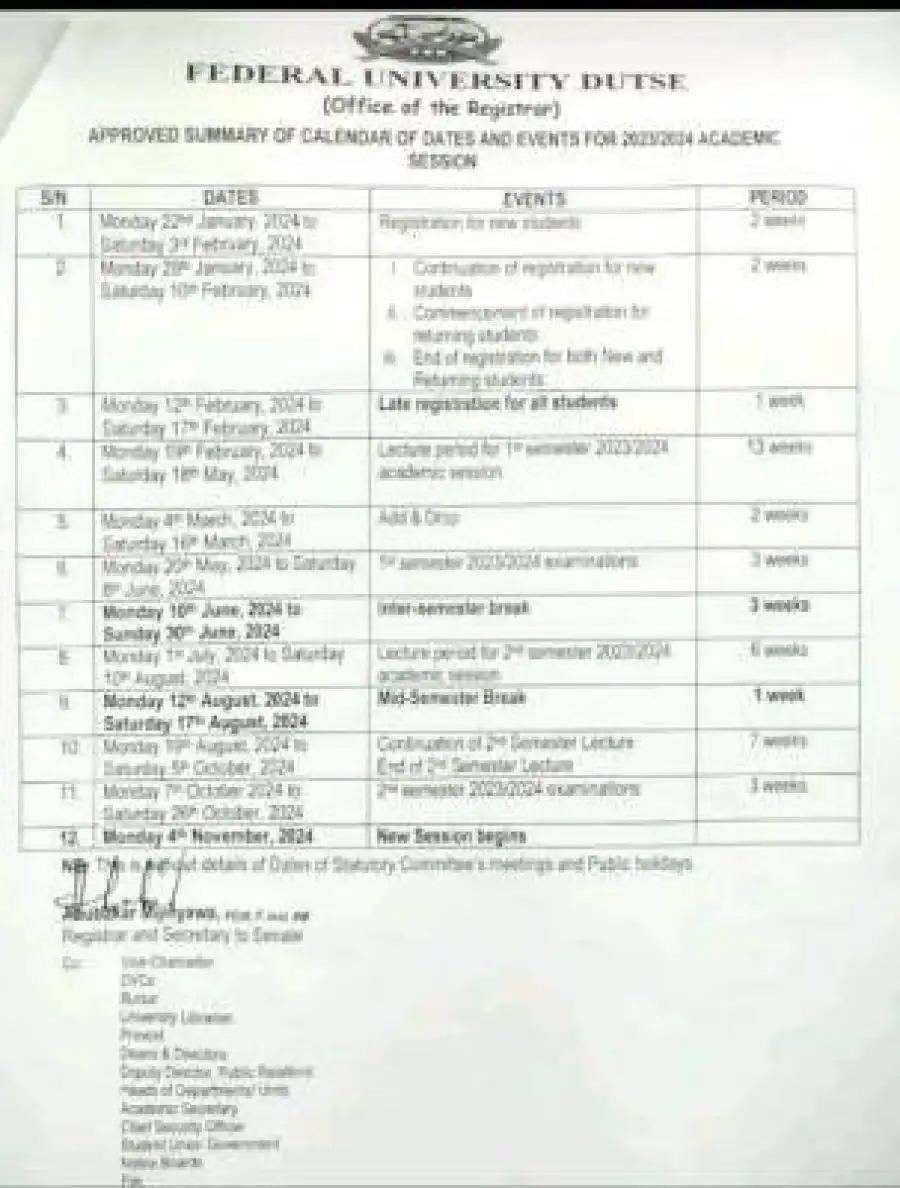 The management of Federal University Dutse has published the academic calendar for the 2023/2024 academic session. The break down of academic activities are as follows