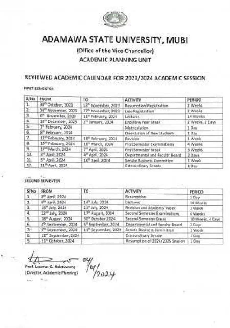 This is to inform the general public that the management of Adamawa State University has released the reviewed academic calendar for the 2023/2024 academic session.