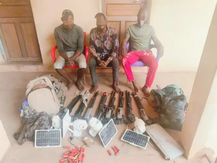 "Eight (8) pump action guns with four (4) live and twenty-six (26) expended cartridges were recovered. Other exhibits recovered include one (1) machete, four (4) units of solar-powered CCTV cameras, thirteen (13) assorted phones, one (1) DVD player, and four (4) bags and clothes, all suspected to be stolen. Also recovered are objects suspected to be charms," the statement said.