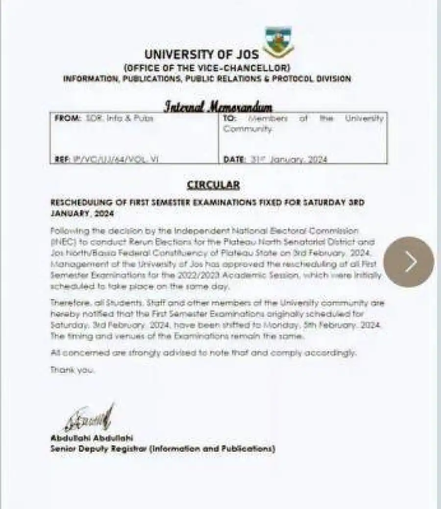 Following the decision by the Independent Natiorial Electoral Commission (INEC) to conduct Rerun Elections for the Plateau North Senatorial District and Jos North/Bassa Federal Constituency of Plateau State on 3rd February, 2024. Management of the University of Jos has approved the rescheduling of all First Semester Examinations for the 2022/2023 Academic Session, which were initially scheduled to take place on the same day.